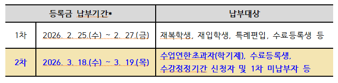 | 제목 | [전체대학원] 2026학년도 1학기 대학원 재·복학생 2차 등록금 납부 일정 안내 | ||||